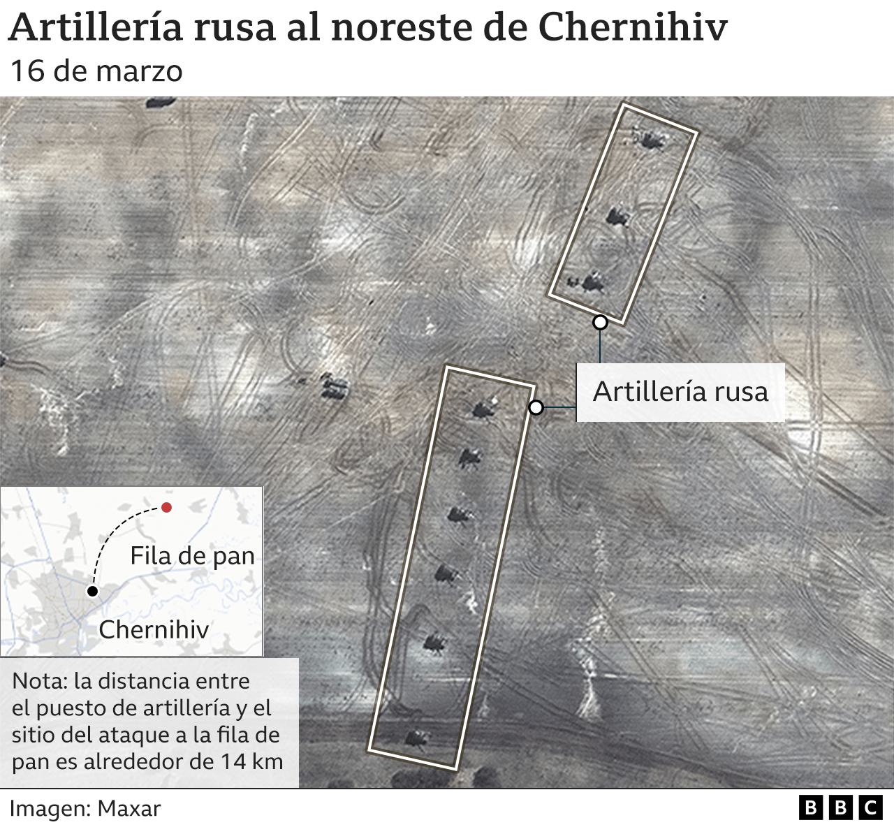 La imagen satelital del 16 de marzo muestra a las fuerzas rusas con este tipo de armas 14 kilómetros al noreste de la ciudad.