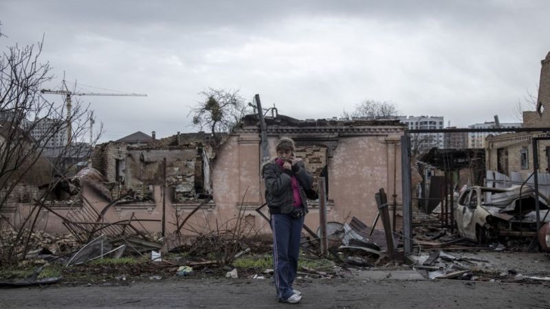 Una mujer en medio de la devastación en Bucha, Ucrania.