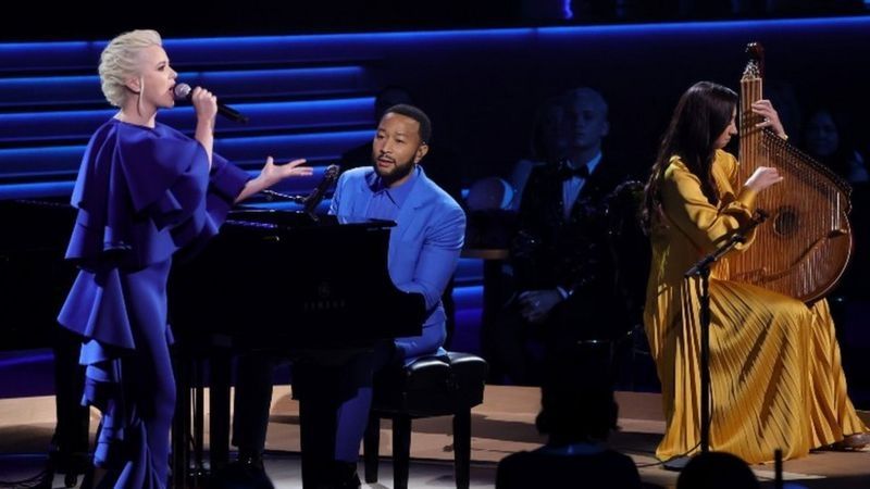 A la intervención del presidente ucraniano le siguió la actuación del pianista John Legend, quien tocó y cantó una nueva canción titulada Free ("Libre").