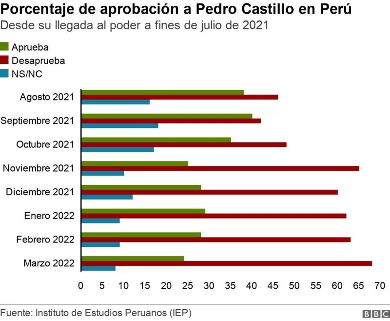 Este cúmulo de situaciones se ha visto reflejado en su descrédito de las últimas encuestas. Ahora mismo Castillo cuenta con un 68% de desaprobación de la ciudadanía, la mayor durante su gobierno, según el Instituto de Estudios Peruanos.