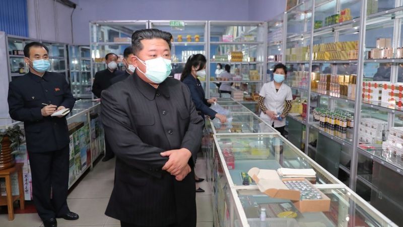 Kim Jong-un en una de sus habituales visitas de campo, en este caso a una farmacia tras el reciente brote de covid