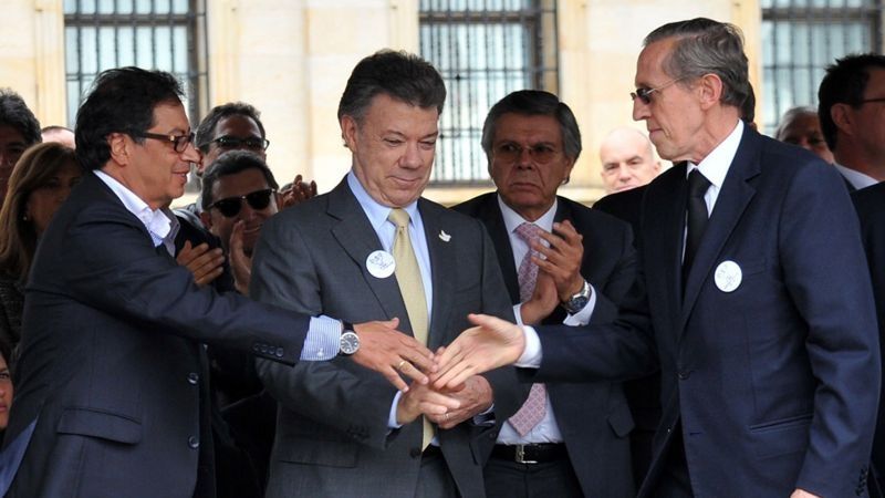 En la celebración de los 25 años de la firma, Gustavo Petro y Antonio Navarro participaron en un acto organizado por el entonces presidente, Juan Manuel Santos
