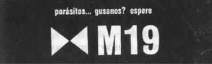 Bajo estas frases, en blanco sobre fondo negro, un logo con dos triángulos enfrentados y unas siglas entonces desconocidas: M-19.