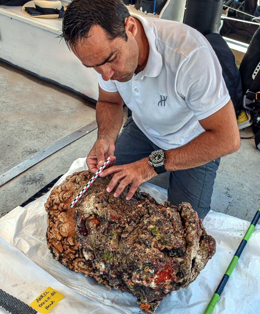 Además, se encontraron muchos objetos del material del buque: clavos de bronce y hierro, el collar de plomo de un ancla de madera de gran envergadura y masas amorfas de concreción de hierro cubiertas de restos marinos.