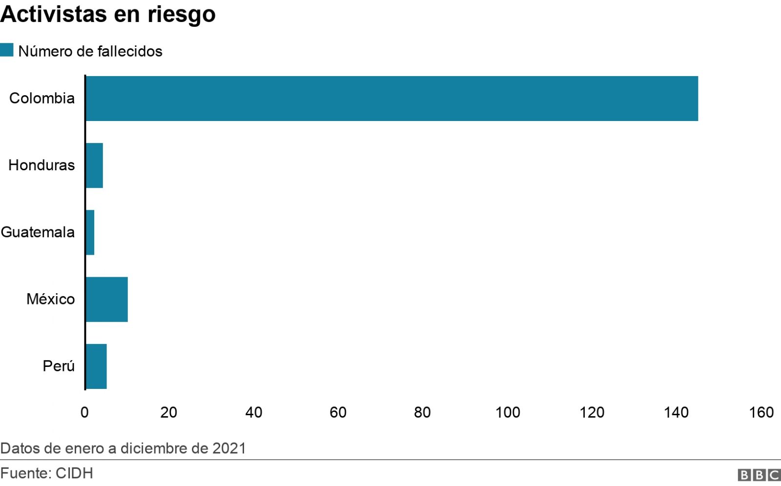 Las cifras de la Comisión son corroboradas por las que manejan otras organizaciones como la irlandesa Front Line Defenders, la cual se especializa en monitorear las condiciones en las que los defensores ejercen su labor alrededor del mundo.