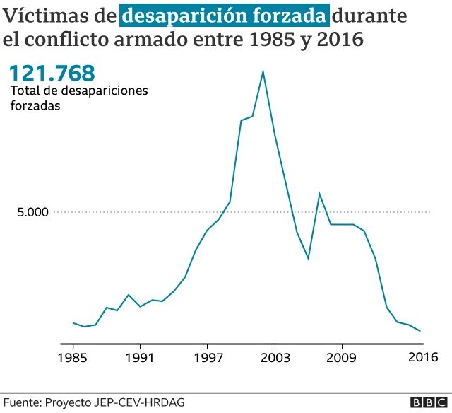 Por ejemplo, las desapariciones forzadas superaron los 100.000 casos, y los secuestros, un flagelo que afectó a casi todo el país, fueron decenas de miles.