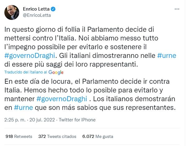 El secretario general del Partido Demócrata, Enrico Letta, que apoyó a Draghi, lamentó "este día de locura en el que el Parlamento decidió ponerse en contra de Italia" y previó un adelanto electoral.