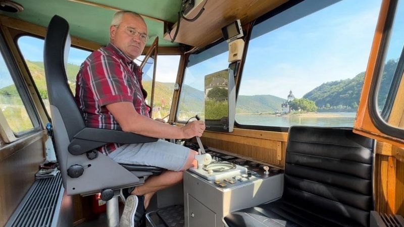 El capitán Andre Kimpel observa con experiencia, pero preocupado, el río y cómo los niveles del agua han disminuido significativamente en los últimos días mientras Europa vive un verano largo y caluroso.