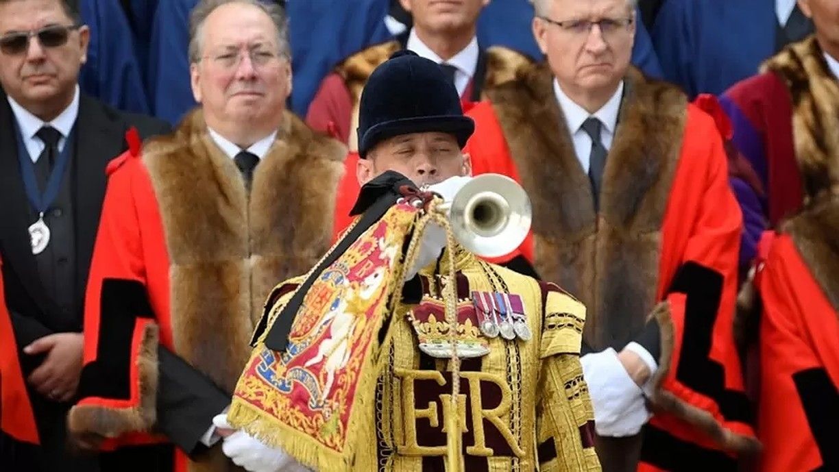 La declaración estuvo acompañada de un espectáculo centenario, con trompetistas tocando una fanfarria y sonó el himno nacional, con las palabras "Dios salve al rey" y no "Dios salve a la reina" por primera vez desde 1952.