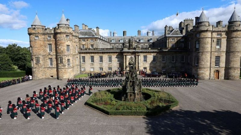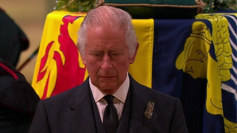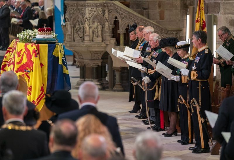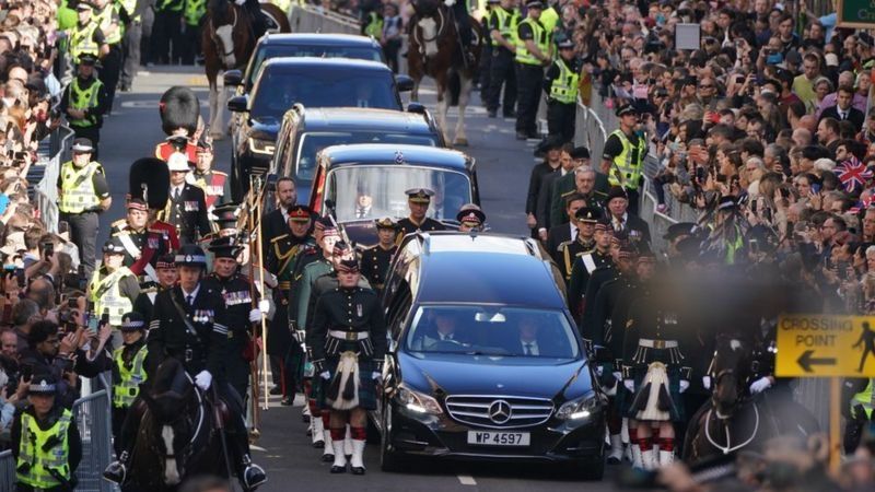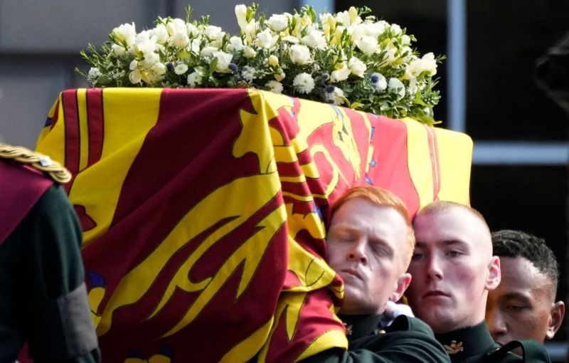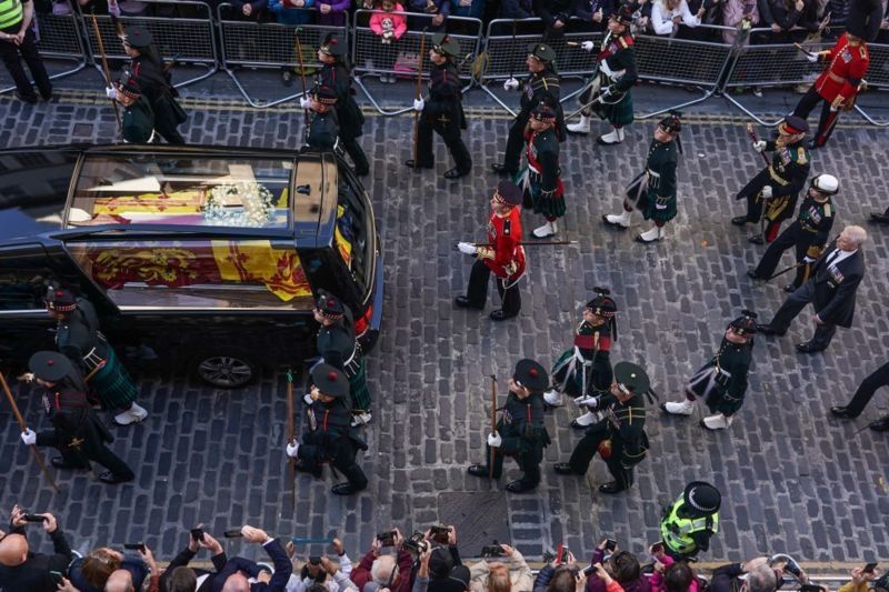 El féretro de la reina Isabel II fue trasladado el domingo desde el castillo de Balmoral, donde murió, hasta Edimburgo. El domingo permaneció en el palacio de Holyroodhouse hasta el lunes, cuando se le llevó en procesión hasta la catedral de St Giles.