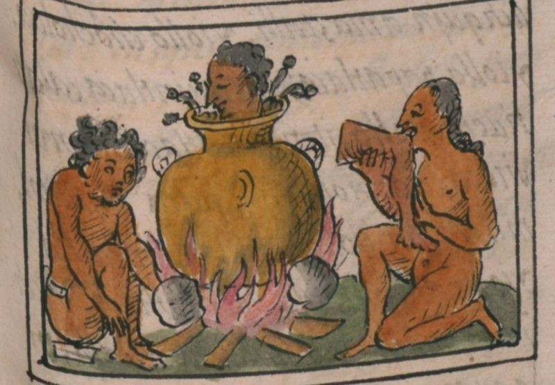 En la "Historia general de las cosas de la Nueva España", el misionero explicaba que "cocían aquella carne con maíz, y daban a cada uno un pedazo de aquella carne en una escudilla o caxete, con su caldo y su maíz cocido".