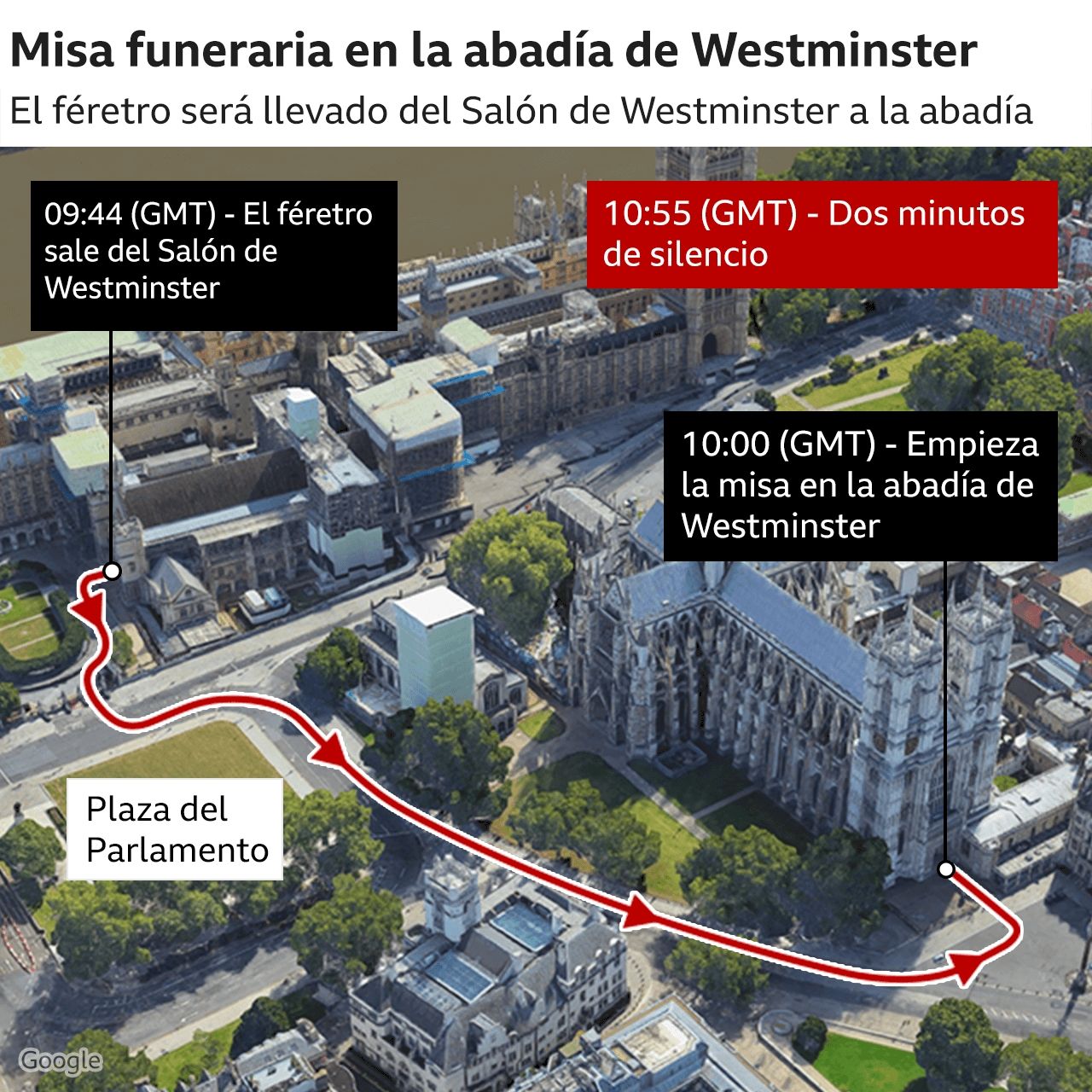 La parte ceremonial del día empezará a las 10:44, cuando el féretro de la reina será trasladado desde el Salón de Westminster hasta la abadía de Westminster, donde tendrá lugar la misa.