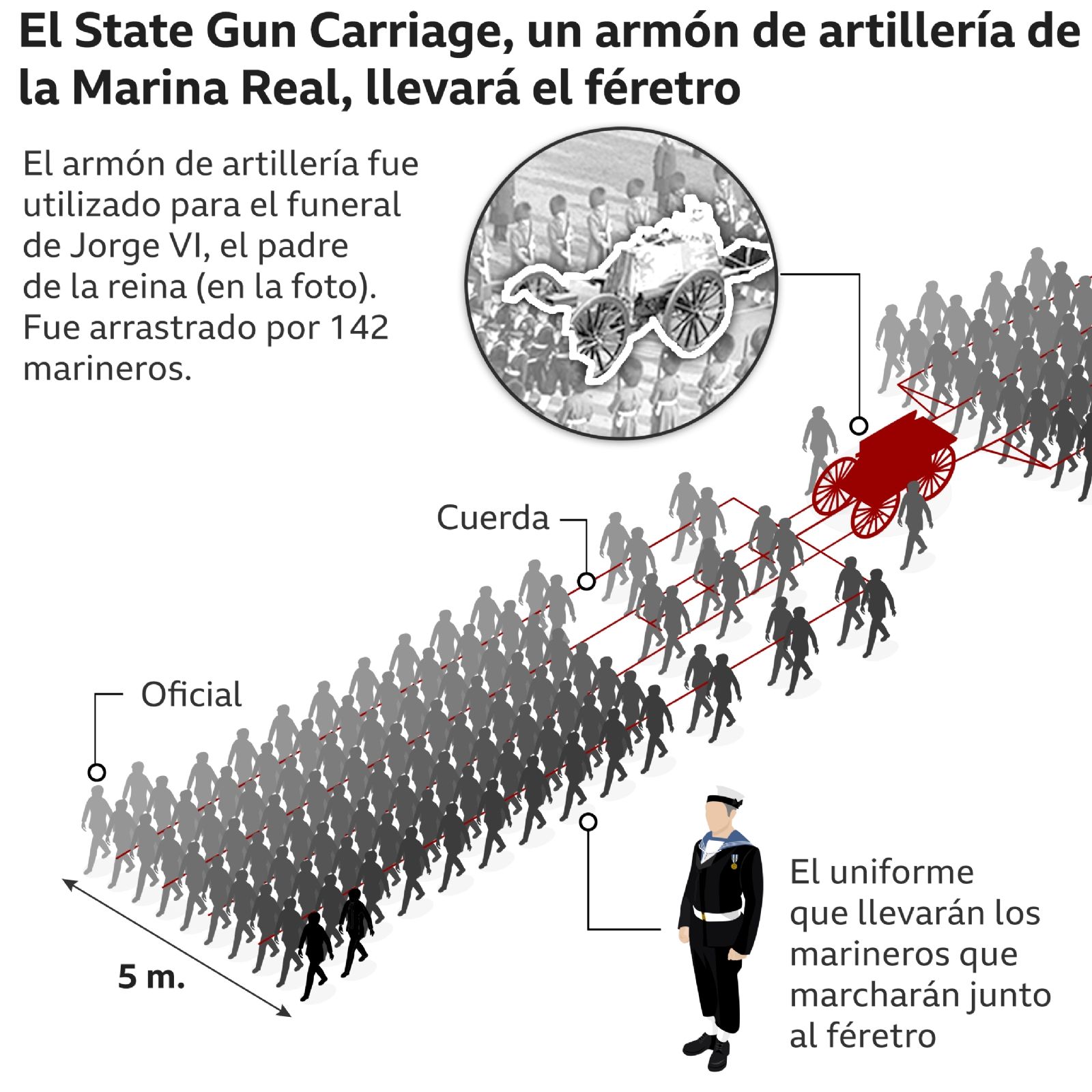 La reina será llevada en el "State Gun Carriage", un carro de artillería de la Marina Real, que será arrastrado por 142 marineros. La última vez que se vio este armón de artillería fue en 1979 para el funeral del tío del príncipe Felipe, Lord Mountbatten. También se usó con el padre de la reina, Jorge VI, en 1952.
