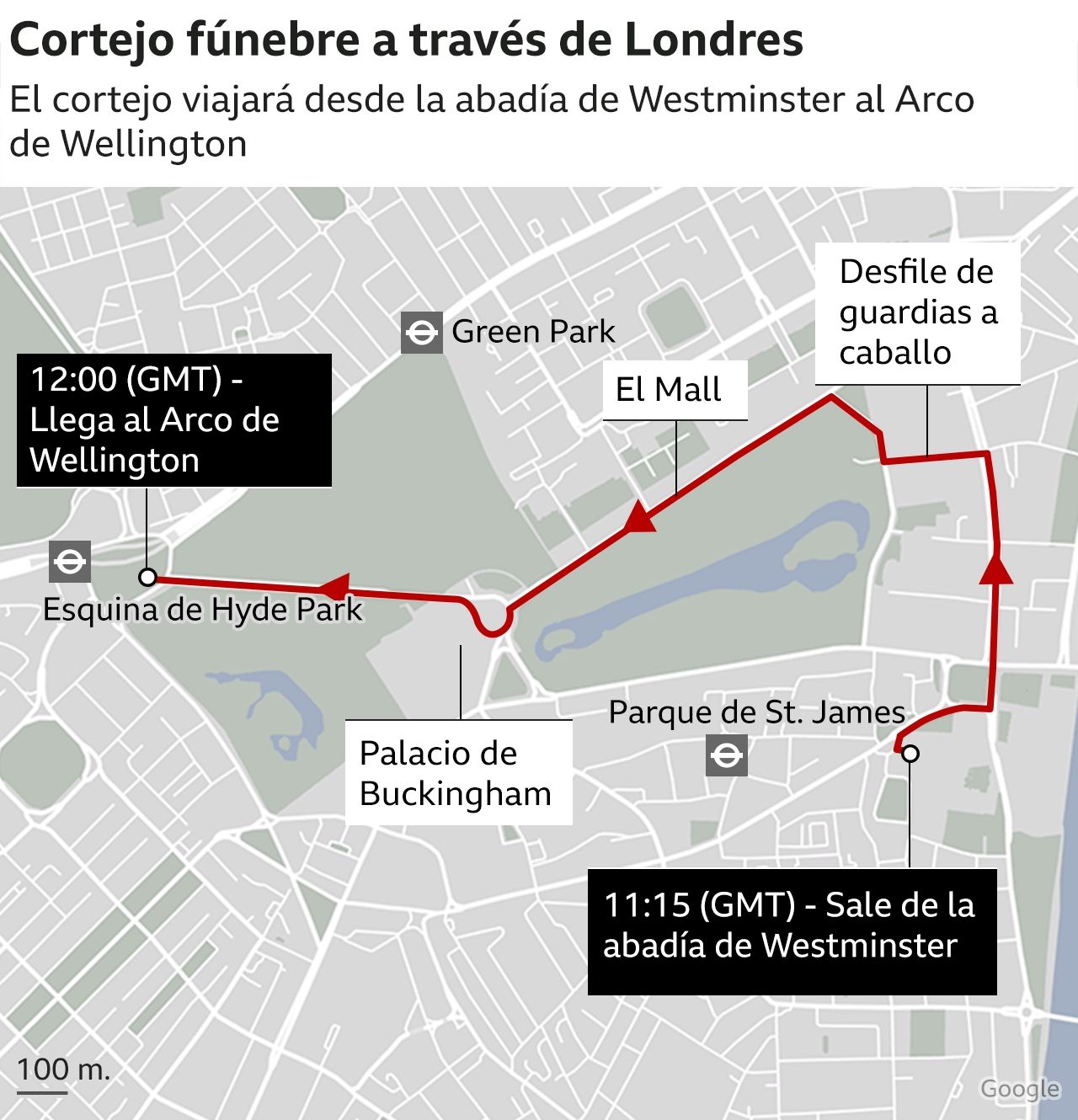 Tras la misa funeraria, en torno a las 12:15, el féretro de la reina será llevado en un cortejo fúnebre desde la abadía hasta el Arco de Wellington, en la esquina de Hyde Park.