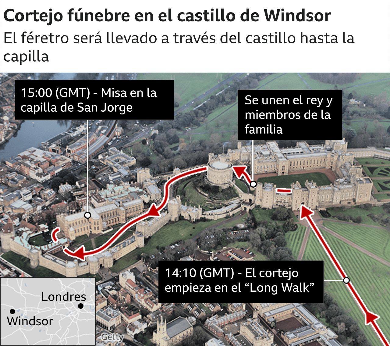 Se espera que el coche fúnebre llegue justo después de las 15:00, para un cortejo a lo largo del paseo conocido como el "Long Walk" del castillo de Windsor. Esta avenida de 5 kilómetros estará flanqueada por miembros de las fuerzas armadas.