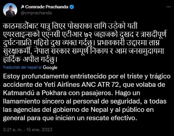 "Hago un llamamiento al personal de seguridad, a todas las agencias del Gobierno de Nepal y al público en general para que inicien un rescate efectivo", publicó en Twitter el primer ministro nepalí, Pushpa Kamal Dahal.