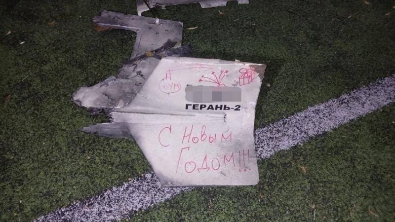 Las autoridades ucranianas mostraron una imagen de un dron lanzado por Rusia que dice, en ruso, "Feliz Año Nuevo".