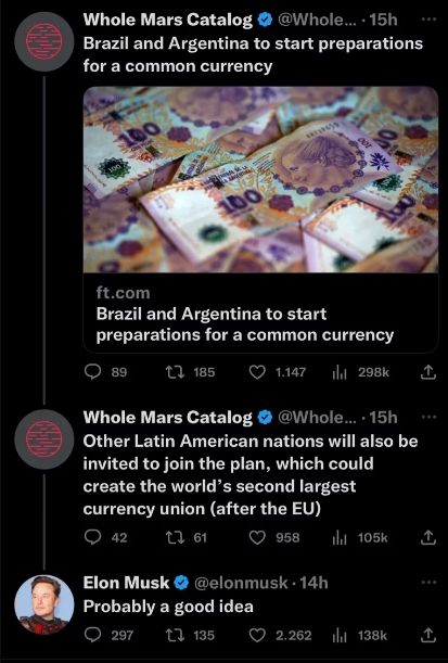 Uno de los empresarios más importantes del planeta y actual dueño de Twitter consideró que "probablemente sea una buena idea" la creación de la monera en común entre Argentina y Brasil.