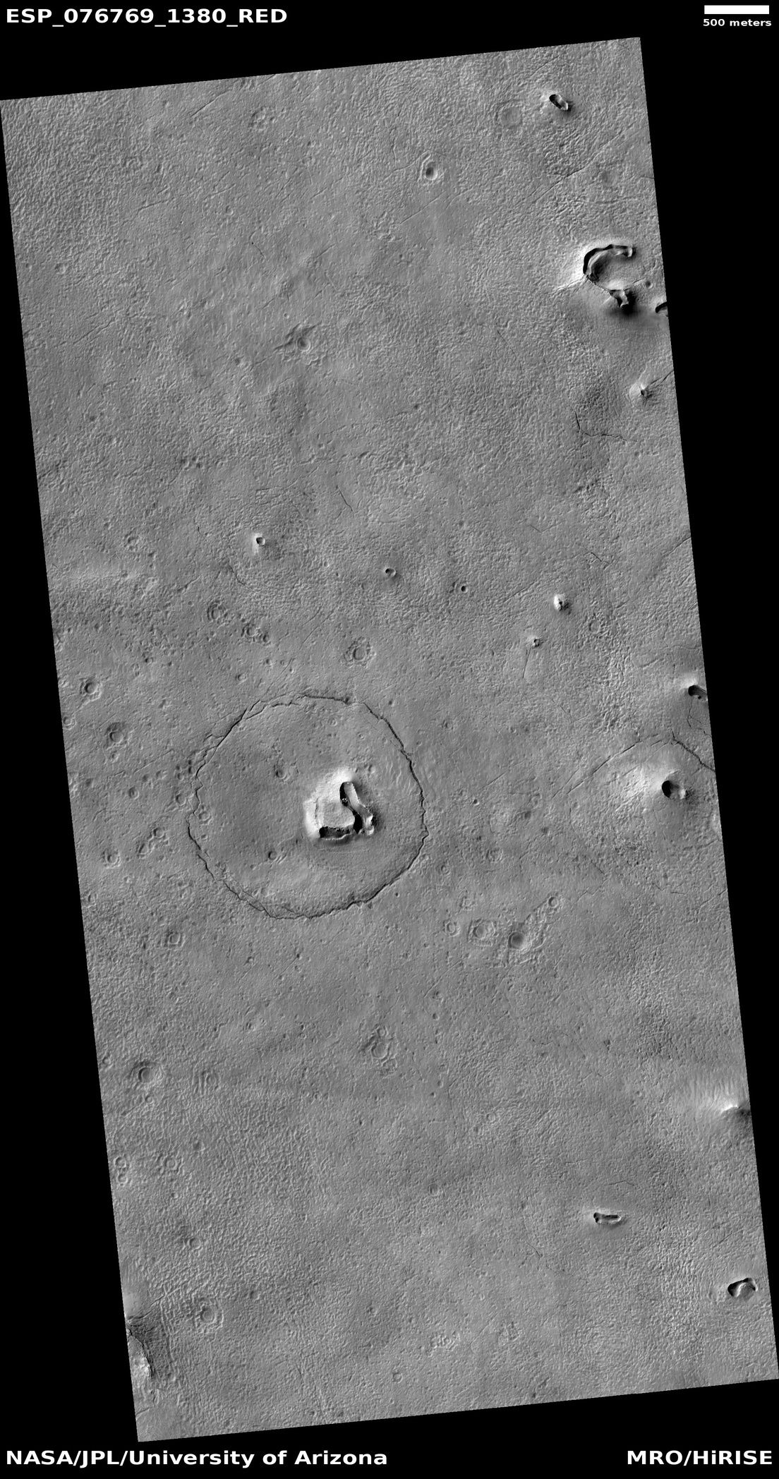 "Hay una colina con una estructura de colapso en forma de V (la nariz), dos cráteres (los ojos) y un patrón de fractura circular (la cabeza)", dijo el equipo de HiRise. "El patrón de fractura circular podría deberse al asentamiento de un depósito sobre un cráter de impacto enterrado".