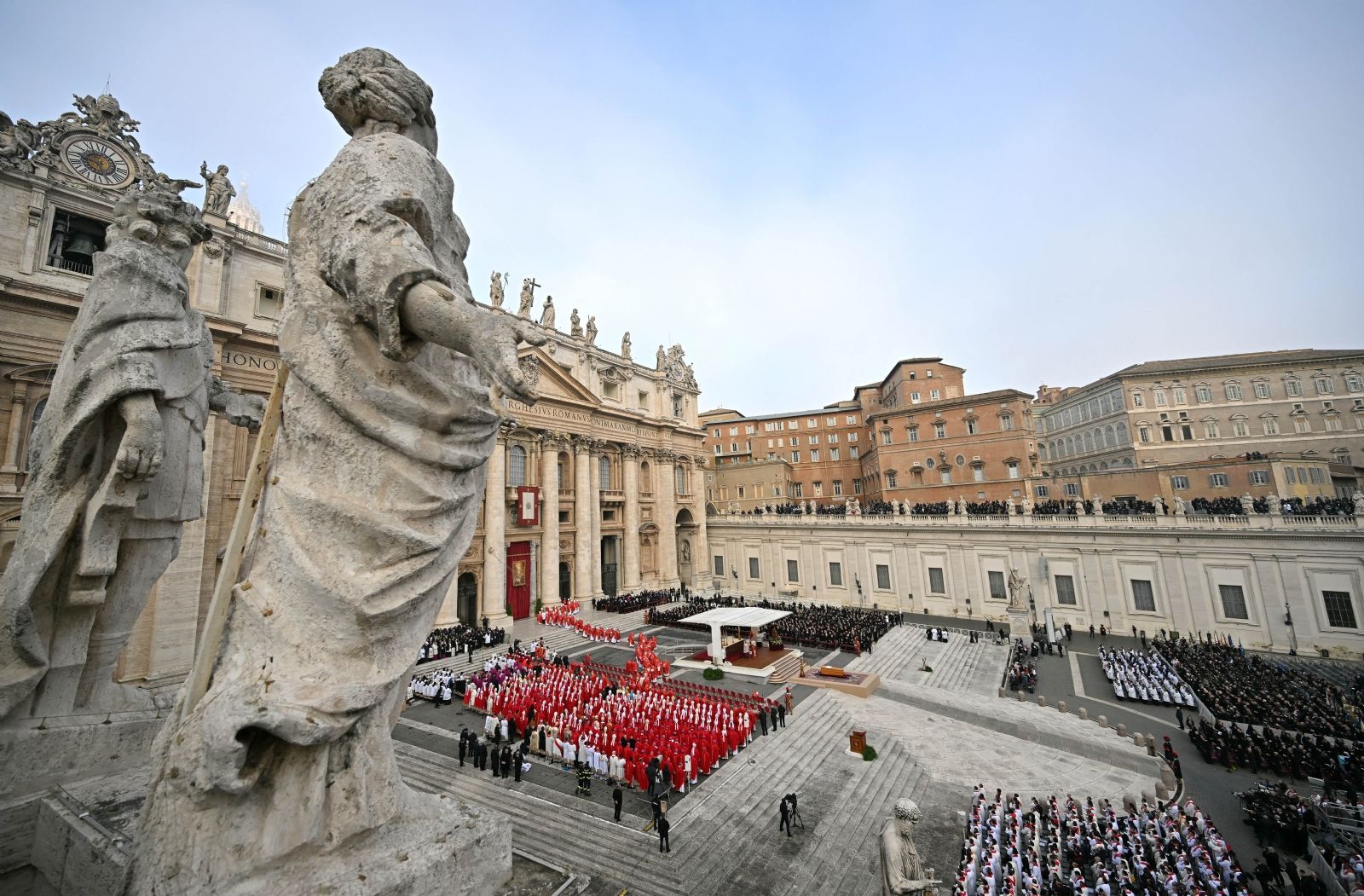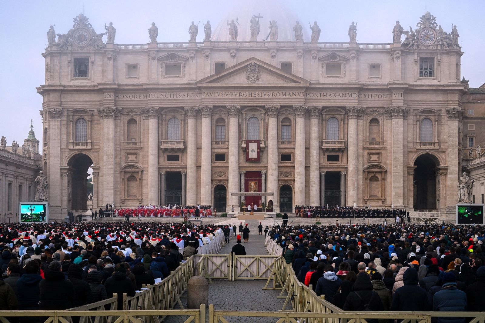 Minutos antes de las 9, cuando la niebla presente en Roma hacía aún imposible distinguir la famosa cúpula de la Basílica, el féretro con el cuerpo del Papa emérito fue depositado en la explanada de San Pedro para que los fieles recen el "Rosario", una oración católica, en su homenaje.