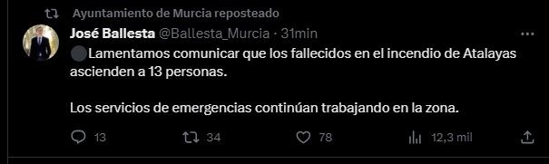"Los servicios de emergencias amplían a trece los fallecidos en el incendio", indicó el ayuntamiento de esa ciudad del sureste de España en X (antes Twitter).