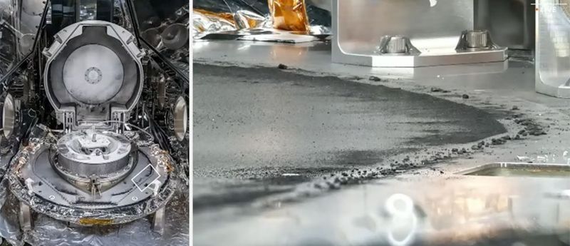 Para realizar sus experimentos iniciales, los científicos utilizaron partículas que se habían derramado desde la cámara interior. Este fino polvo de Bennu cubre todas las superficies circundantes del recipiente.