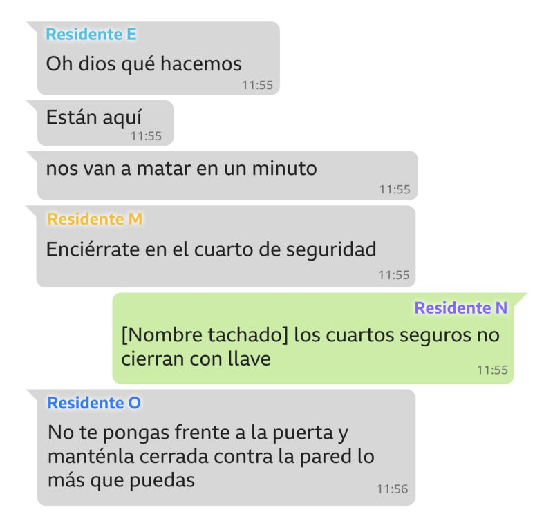 Una portavoz de la comunidad compartió este chat grupal con la BBC. Es una de las madres del chat y nos brindó los detalles para que pudiéramos ver cómo se desarrolló el terror en ese día y cómo actuaron estas mujeres en las horas de mayor desesperación, y en algunos casos las últimas, de sus vidas.