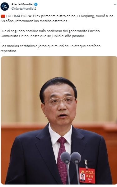 "El camarada Li Keqiang, mientras descansaba en Shanghái en los últimos días, sufrió un repentino ataque al corazón el 26 de octubre y, tras fracasar todos los esfuerzos por reanimarlo, falleció en Shanghái diez minutos después de la medianoche del 27 de octubre", informó la cadena estatal CCTV.