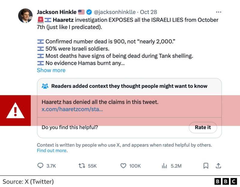 Uno de sus tuits utilizó imágenes antiguas de ataques israelíes en Gaza para ilustrar los acontecimientos actuales en Siria. Otro citó una supuesta investigación de Haaretz, un periódico liberal israelí, que, según él, confirmaba que 900 personas (en lugar de más de 1.200, según el último recuento oficial) murieron en los ataques de Hamás, y que la mitad de ellas eran soldados israelíes.