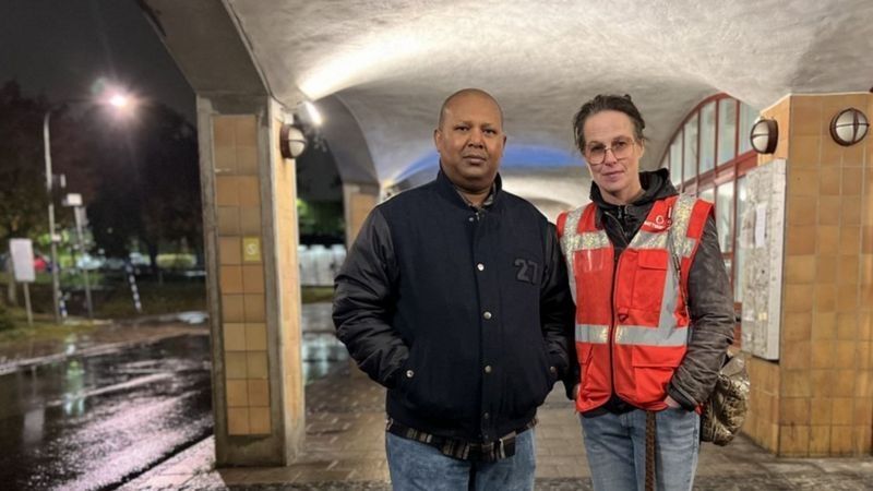 "Salir caminando y andar por ahí charlando con nuestros hijos aumenta la seguridad", dice Libaane Warsame durante un paseo nocturno por Jarva, al norte de Estocolmo, en una noche de viernes húmeda y ventosa.