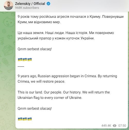 "Hace nueve años comenzó la agresión rusa en Crimea. Si devolvemos Crimea, restableceremos la paz. Es nuestra tierra. Nuestro pueblo. Nuestra historia. Devolveremos la bandera ucraniana a todos los rincones de Ucrania", escribió Zelenski en un mensaje en Telegram.