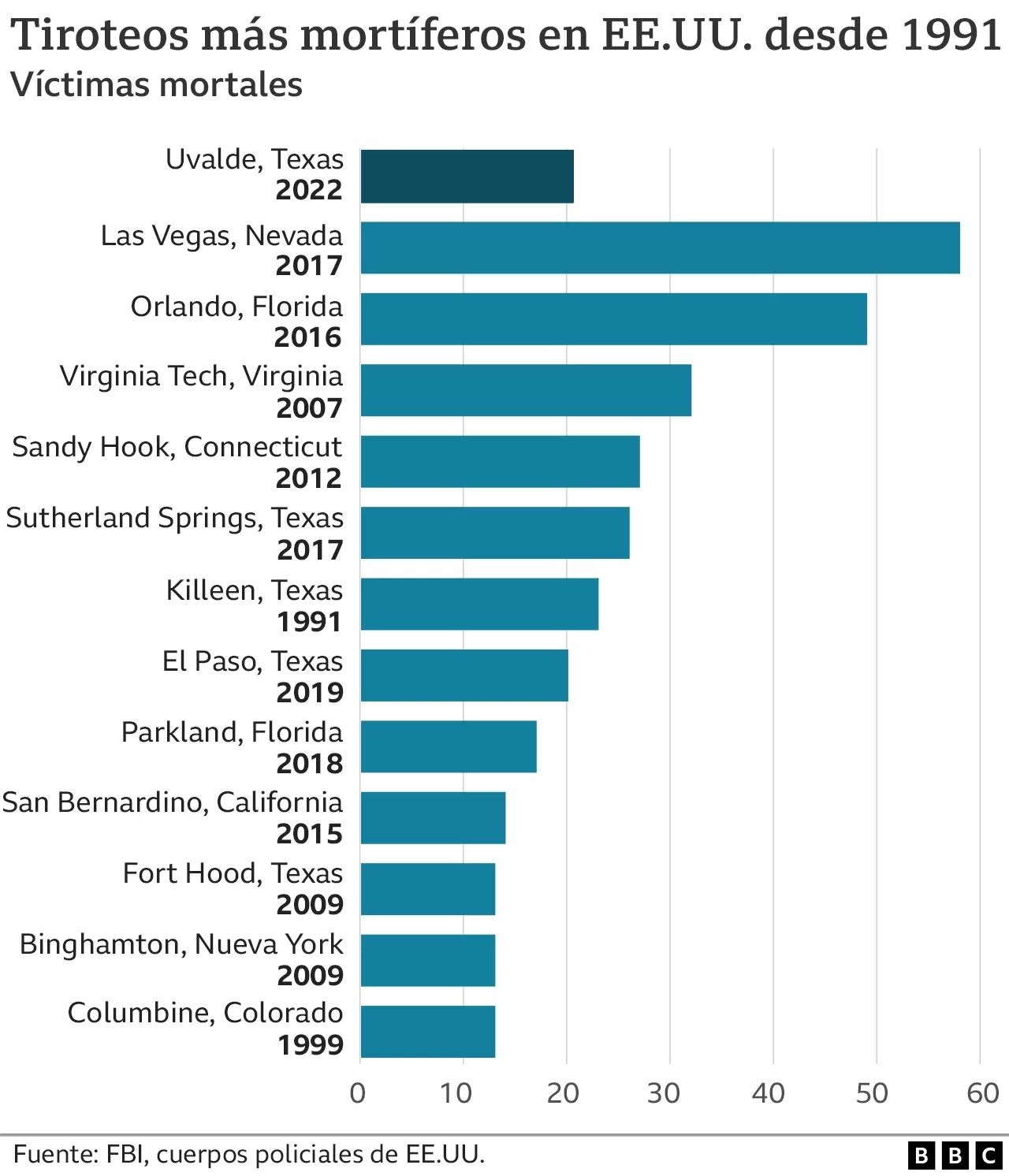 Estados Unidos no tiene una definición simple para "tiroteos masivos". El Archivo de la Violencia de Armas de Fuego lo define como un incidente en que cuatro o más personas mueren o son heridas. Sus datos recogen tiroteos ocurridos en hogares y espacios públicos.
