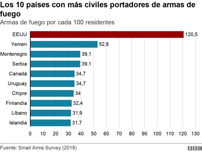 En este país hay una tasa de 120,5 armas por cada 100 residentes, un incremento del 88% desde 2011. Sobrepasa por mucho las tasas de otros países alrededor del mundo.