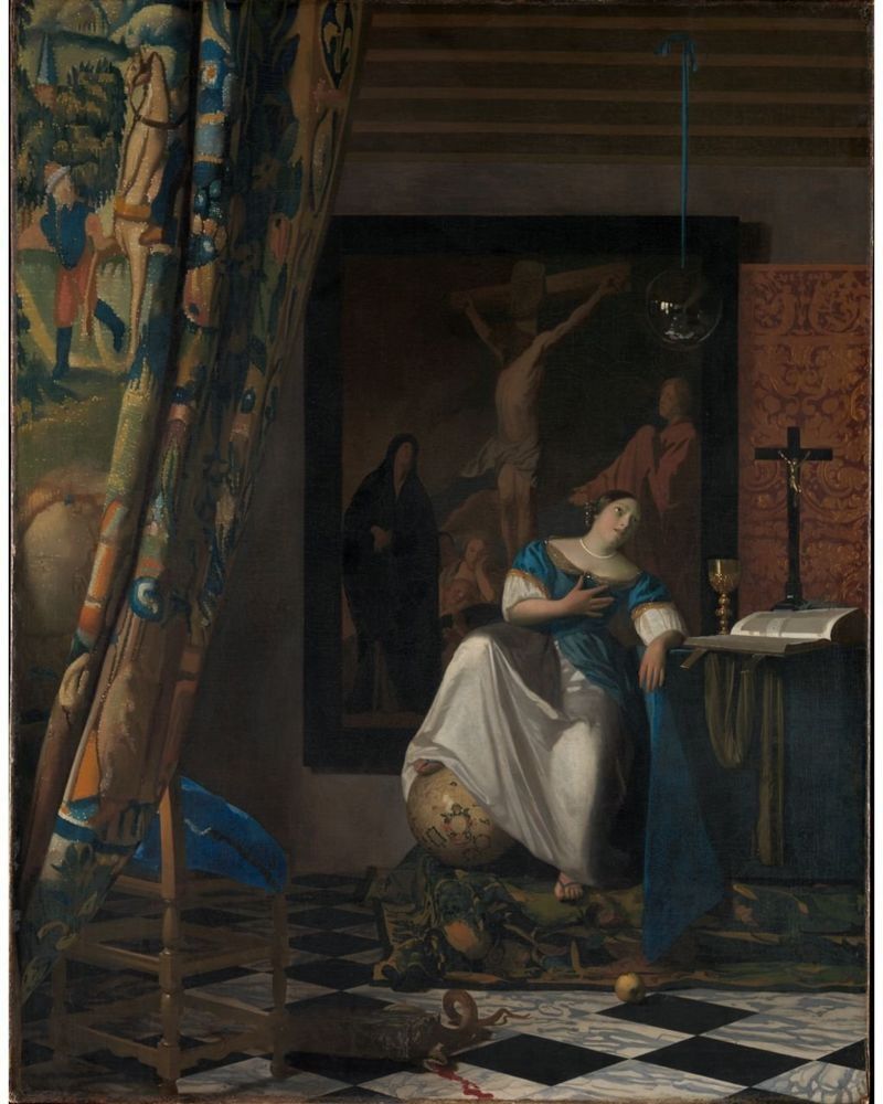 Se sabe que Vermeer usaba el lenguaje simbólico del arte como fue definido en el libro de alegorías "Iconología" de Cesare Ripa, que fue traducido al neerlandés en 1644.