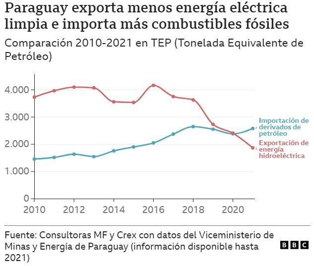 Sin embargo, en los últimos años está exportando cada vez menos hidroelectricidad y está importando cada vez más derivados de petróleo, que se utilizan en el transporte, como lo muestra el gráfico.