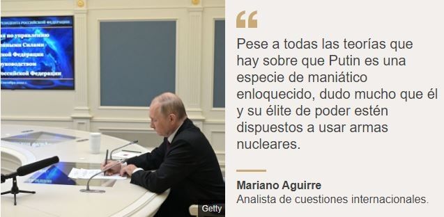 Rusia ha amenazado de forma más o menos explícita con que podría llegar a utilizar armas nucleares, pero creo que pese a todas las teorías que hay sobre que Putin es una especie de maniático enloquecido, dudo mucho que él y su élite de poder estén dispuestos a usar armas nucleares.