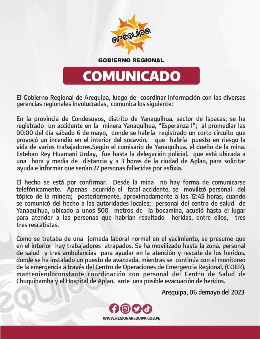 l hecho ocurrió el sábado en la madrugada en la minera Yanaquihua, ubicada en la provincia de Condesuyos, del departamento de Arequipa, al parecer por un corto circuito que provocó un incendio al interior del socavón, informó el Gobierno Regional.