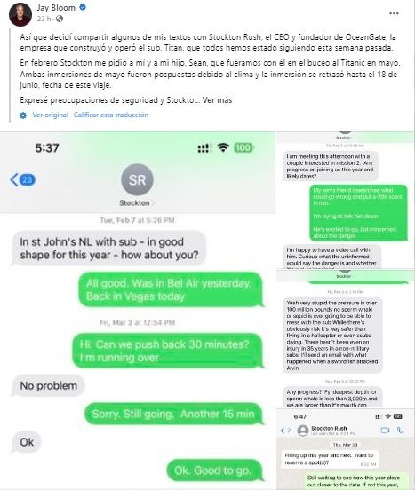 El jueves, después de que la Guardia Costera estadounidense anunciara que había localizado trozos del Titán en el fondo del océano, Bloom publicó en Facebook una serie de mensajes de texto entre él y Rush de principios de año, en los que este último descartaba la idea de que el viaje fuera peligroso.