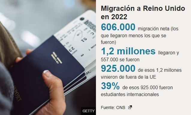La migración neta (las personas que llegan a Reino Unido menos los que se marchan) se situó en 2022 en 606.000 personas, según datos divulgados en mayo por la Oficina de Estadísticas Nacionales británica (ONS, por sus siglas en inglés).