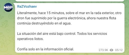 El gobernador ruso de Sebastopol, Mijaíl Razvozhayev, informó en Telegram esta mañana que un décimo drone fue neutralizado sobre el mar Negro con sistemas de interferencia electrónica.