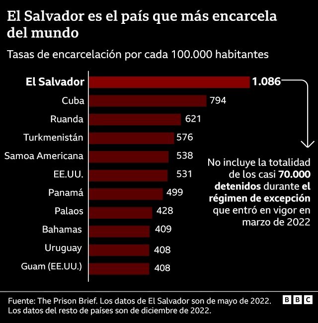 Mientras, en su visita al país, BBC Mundo constató que hablar de vulneraciones de derechos humanos parece secundario para muchos salvadoreños, quienes se centran en destacar la evidente mejoría en la seguridad de una nación que, tras asfixiarse con una tasa de 106,3 homicidios por cada 100.000 habitantes en 2015, cerró 2022 con 7,8, según cifras oficiales.