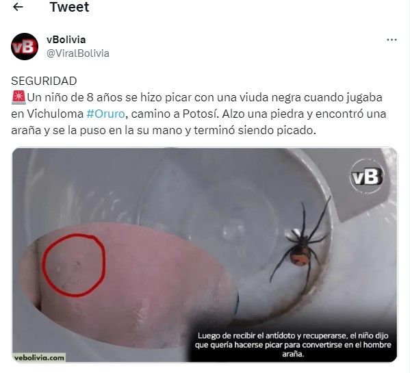 "Después del suceso, el pequeño comenzó a experimentar malestar y decidió contarle a su madre, que lo llevó de inmediato a un centro de salud. Debido a la gravedad de la situación, fue remitido al Hospital General San Juan de Dios de Oruro, donde recibió un antídoto contra el veneno de la viuda negra", revela el diario.