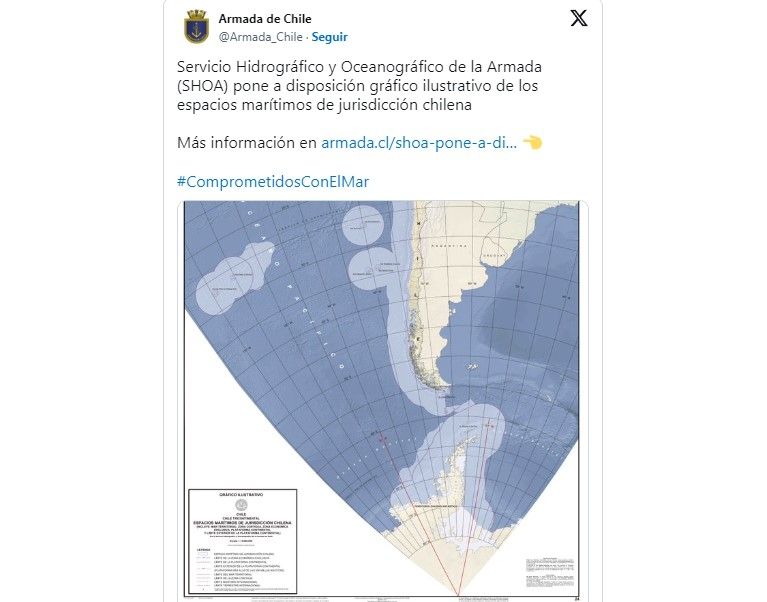 "Este registro representa el Mar Territorial, la Zona Contigua, la Zona Económica Exclusiva, la Plataforma Continental y el Límite exterior de la Plataforma Continental y permite visualizar todos los espacios marítimos de jurisdicción para fines académicos, técnicos y/o jurídicos, de modo que se pueda conocer en su totalidad el territorio nacional y sus proyecciones asociadas. En el documento de presentación, la SHOA explicó que el mapa permitirá contribuir al cumplimiento de la misión encomendada por el Estado de Chile con respecto a la Seguridad e Intereses Marítimos del país", ilustra la agencia Rt.