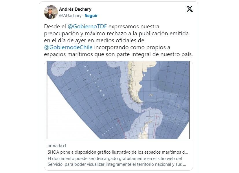 Por otra parte, siguiendo esta línea, Andrés Dachary, secretario de Malvinas, Antártida, Islas del Atlántico Sur y Asuntos Internacionales de la provincia de Tierra del Fuego salió a criticar a Chile: "expresamos nuestra preocupación y máximo rechazo a la publicación emitida en el día de ayer en medios oficiales del Gobierno de Chile incorporando como propios a espacios marítimos que son parte integral de nuestro país. Este avasallamiento a nuestra soberanía colisiona por completo con el espíritu de hermandad de nuestros pueblos y con el constante avance en el proceso de integración entre ambas naciones", refirió.