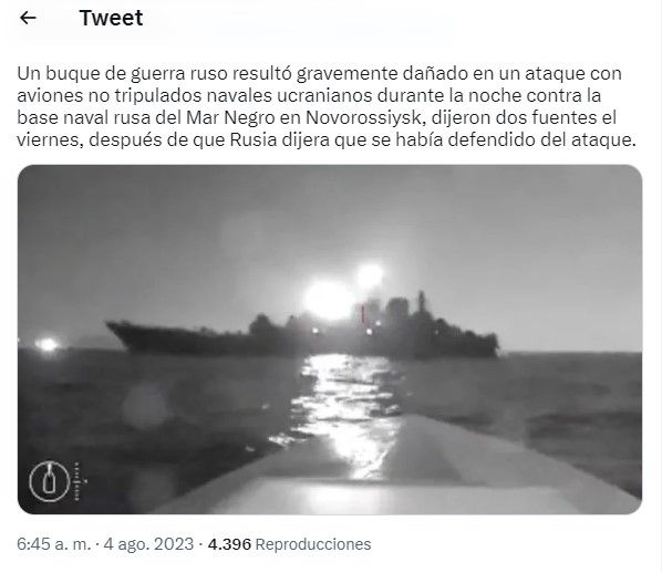 Según Defensa, los drones acuáticos fueron detectados visualmente y destruido por buques que custodiaban en la rada exterior de la base, situada en la región de Krasnodar, al este de Crimea.