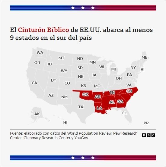 Ubicado en el sur de Estados Unidos, el Cinturón Bíblico es un extenso territorio que incluye al menos nueve estados de mayoría protestante en el que Trump arrasó en las últimas elecciones presidenciales.