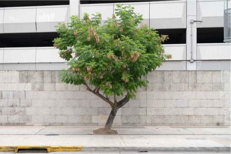 Pero el par de fotos que definen su proyecto los deja para el final de su libro. Son del mismo edifico. La primera foto tiene un frondoso árbol en frente. Al voltear la página está la foto posterior, sin el árbol.