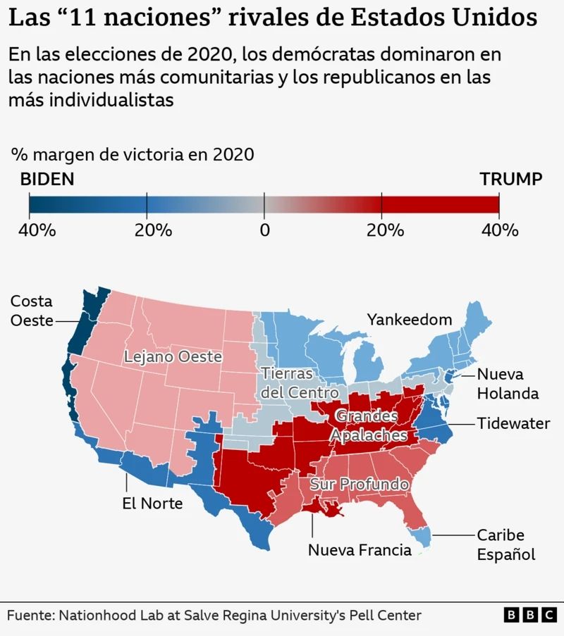 En este mapa puedes ver cómo se distribuyen geográficamente las 11 naciones históricas y su correlación política actual según su tendencia republicana o demócrata.