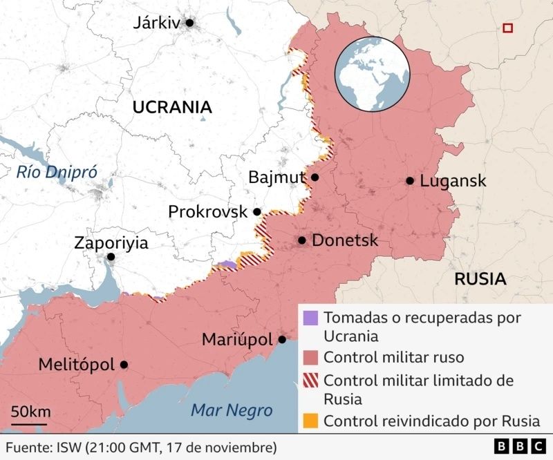 Más de 1.000 km2 han sido tomados entre el 1 de septiembre y el 3 de noviembre, sugiriendo que la ofensiva se aceleró en meses recientes. Dos áreas que han recibido el golpe de estos avances son Kúpiansk, en la región de Járkiv, y Kurájove, un trampolín al eje logístico clave de Pókrovsk, en la región de Donetsk.