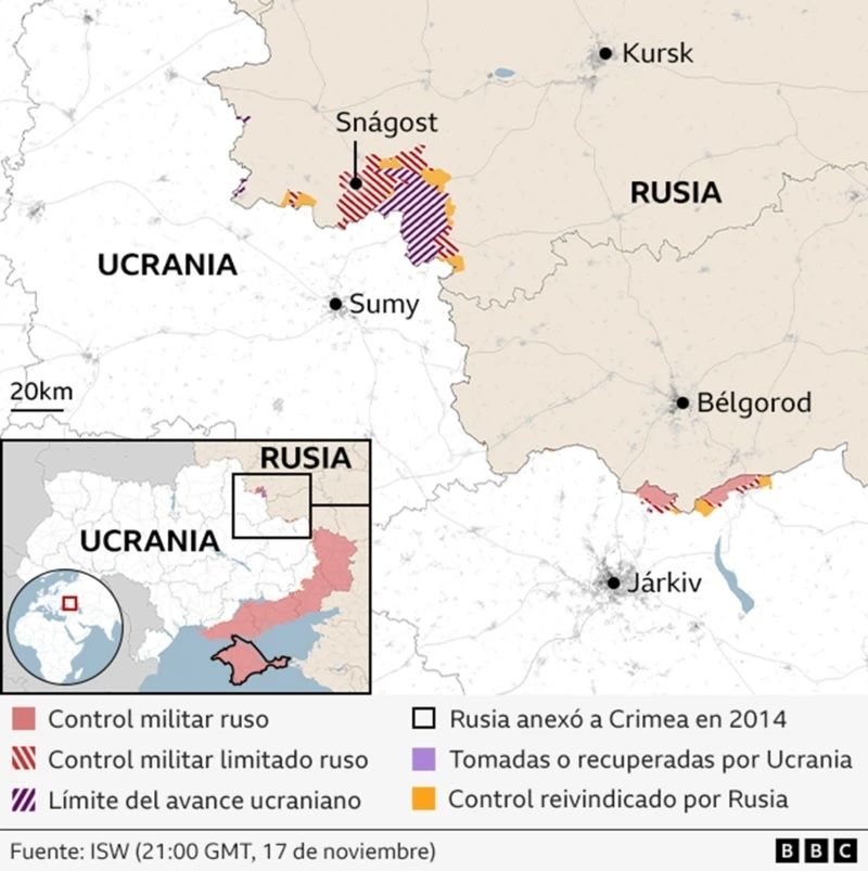 El martes, Ucrania lanzó misiles de largo alcance suministrados por EE.UU. contra territorio en Rusia por primera vez, un día después de que Washington diera la autorización. Se cree que esa decisión fue tomada en parte para ayudar a Ucrania a mantener el control de una zona de la región de Kursk, que le podría servir como moneda útil en una negociación futura.